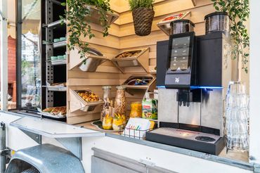 Alles ist modular und individuell anpassbar und die Größe von 3x2 Metern macht den Anhänger flexibel und leicht rangierbar. Eine passende Beleuchtung und Überdachung sorgen für eine angenehme Atmosphäre und der Anhänger ist von drei Seiten zugänglich, um eine reibungslose Bedienung zu gewährleisten.